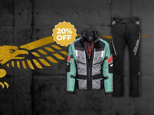 *Das Angebot gilt für die unverbindliche Preisempfehlung in offiziellen Online-Shops und bei teilnehmenden Moto Guzzi-Vertragshändlern. Die Aktion beinhaltet einen Rabatt von 20% auf eine Auswahl von Artikeln, solange der Vorrat reicht. Angebotsdauer: vom 01.12.2025 bis zum 31.12.2025.